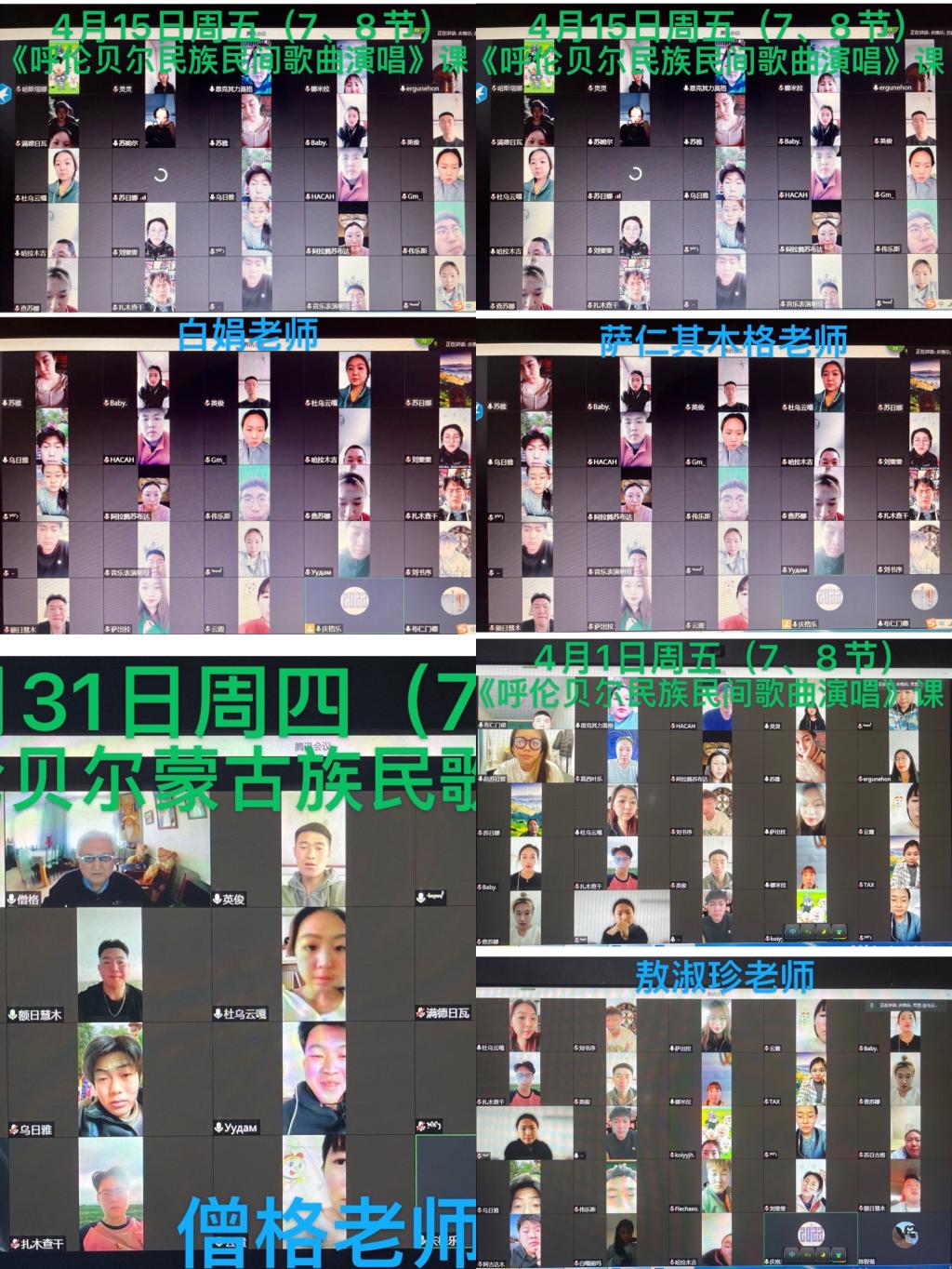 为进一步推行公司办学特色,传承呼伦贝尔传统音乐文化,本学期的特色课程《呼伦贝尔民族民间歌曲演唱》、《呼伦贝尔蒙古族民歌演唱》均在线上进行。分别由巴尔虎、布里亚特、厄鲁特蒙古民歌传承人萨仁其木格、道力金、僧格及达斡尔、鄂温克、鄂伦春民歌传承人敖淑珍、乌日娜、白娟老师授课。