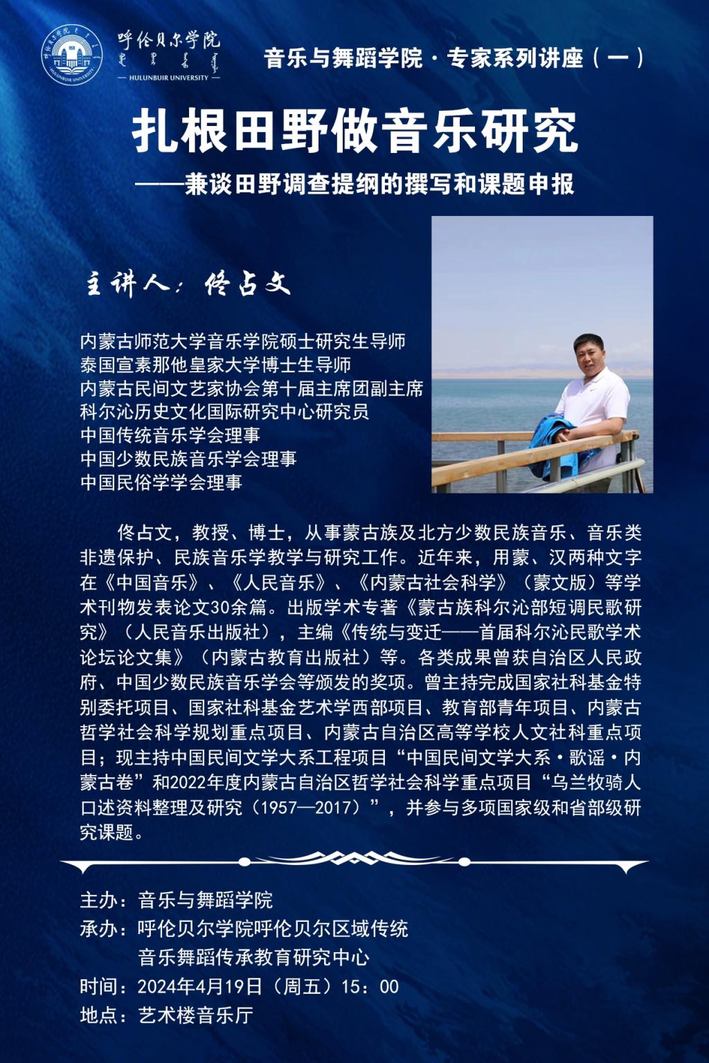 2024年4月19日下午15:00,英国威廉希尔公司邀请内蒙古师范大学音乐公司的硕士生导师佟占文教授为全院师生举办了主题为《扎根田野做音乐研究——兼谈田野调查提纲的撰写和课题申报》的讲座。本次讲座由williamhill威廉希尔主办,williamhill官网呼伦贝尔区域传统音乐舞蹈传承教育研究中心承办,由英国威廉希尔公司经理灵芝教授主持。