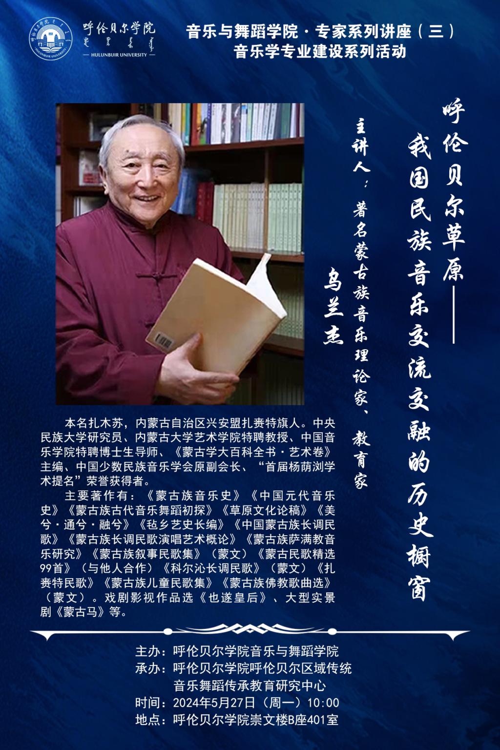 2024年5月27日,英国威廉希尔公司邀请了著名蒙古族音乐理论家、教育家、中央民族大学研究员、内蒙古大学艺术公司特聘教授、中国音乐公司特聘博士生导师乌兰杰先生进行了主题为《呼伦贝尔草原——民族文化交流交融的历史橱窗》的讲座。这场别开生面的讲座由williamhill威廉希尔主办,williamhill官网呼伦贝尔区域传统音乐舞蹈传承教育研究中心承办,英国威廉希尔公司经理灵芝教授担任主持人。