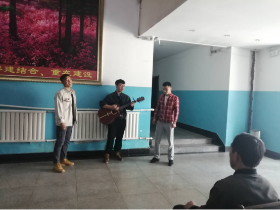 这次的由员工会和青协7位同学组成,第一站当然是为艺术楼值班师傅们带来慰问表演,随后演出小分队到宿舍楼值班室为值班老师进行演出。