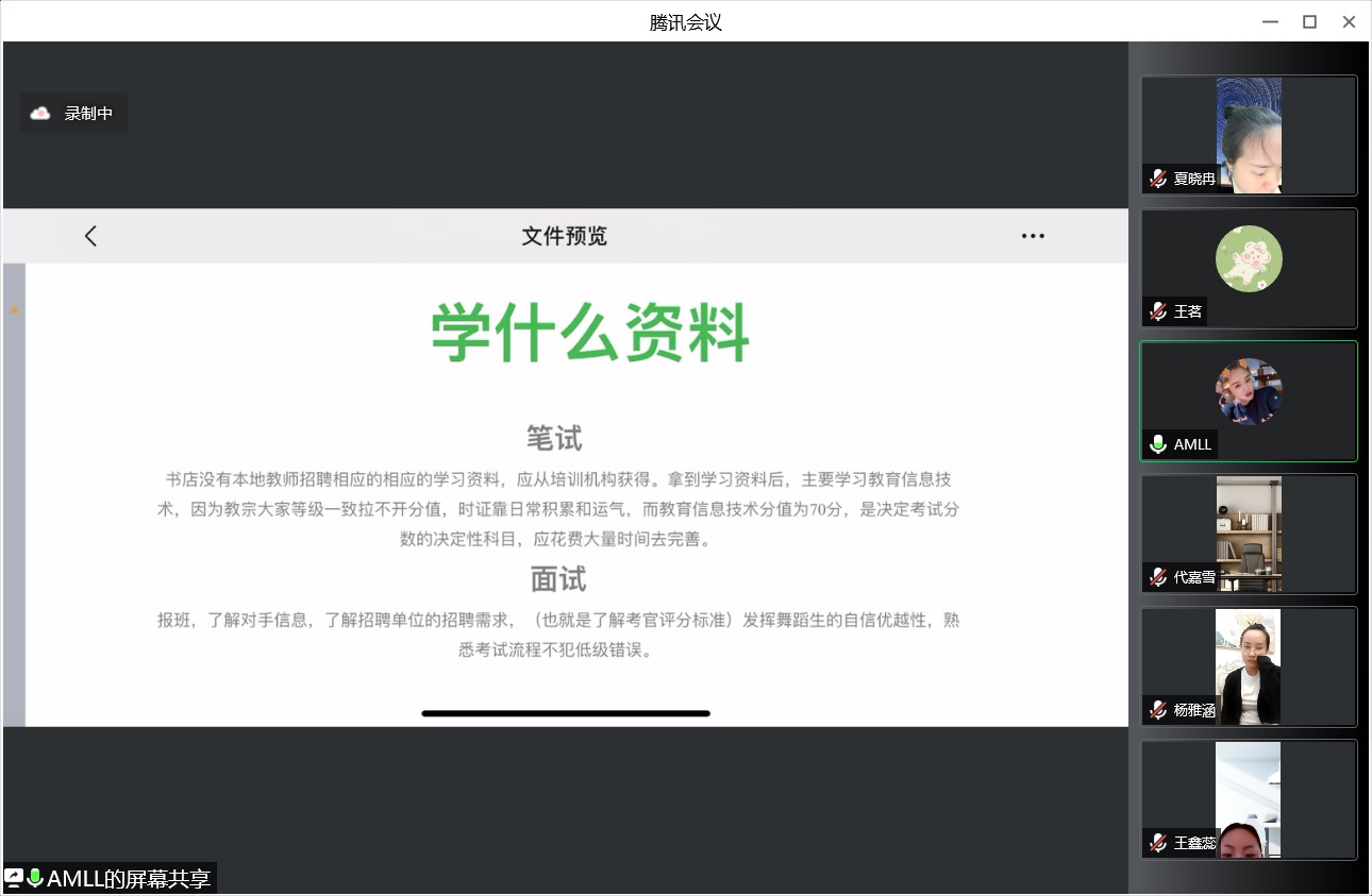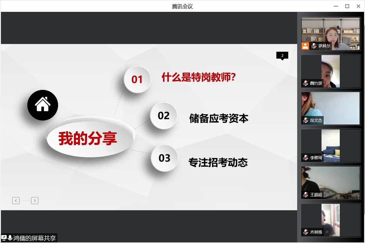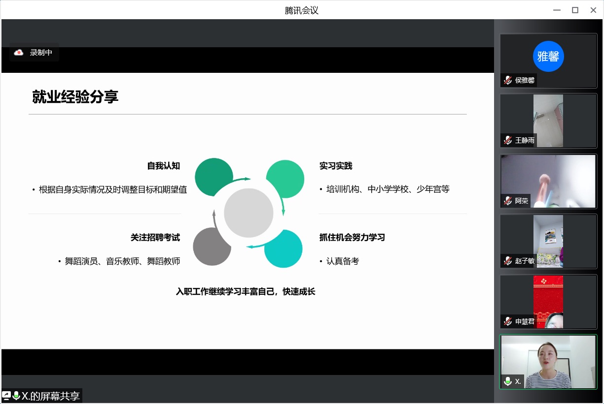 现就职于兴安盟乌兰浩特市科尔沁右翼前旗哈拉黑中学杨红茹、现工作于呼伦贝市海拉尔第二中学任舞蹈教师的谢婷、现工作于通辽市直属教育单位在编教师满靓靓三位员工为舞蹈系员工分享了舞蹈教团队格证、教师招聘考试等备考经验。她们以亲身经历分别从如何备考、怎么更好的进行职业规划、就业后的一些经验、特岗教师与普通教师的备考不同之处等方面做了详细讲解。