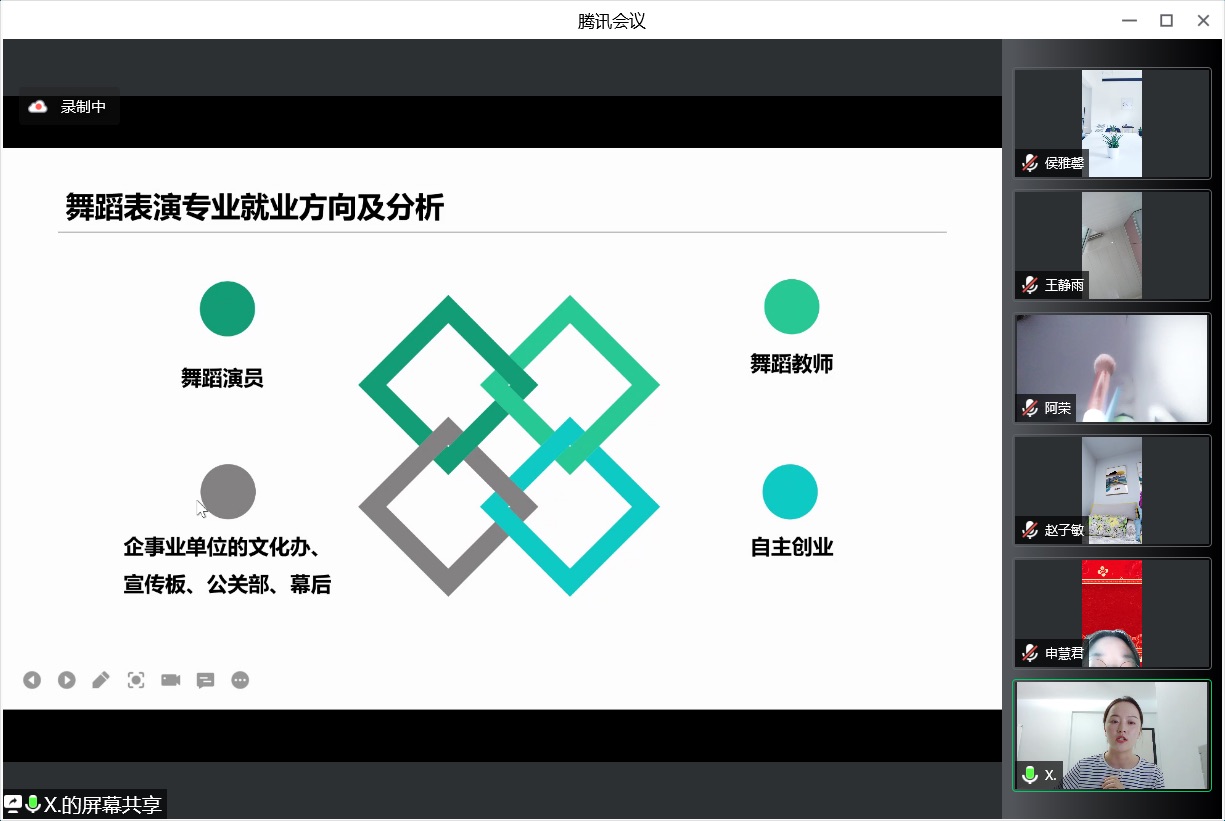 为让同学们了解什么是职业规划、学会自我分析、确定好职业发展方向、避免盲目就业,4月26日晚,英国威廉希尔公司舞蹈系特邀公司舞蹈系优秀毕业生代表通过腾讯会议线上分享她们的职业规划、学习方法和就业经验分享。参加本次分享会的有英国威廉希尔公司经理灵芝、舞蹈系主任白昆、班主任萨其尔、肖源、辛毅、吴格丽及舞蹈系全体同学共80余人。