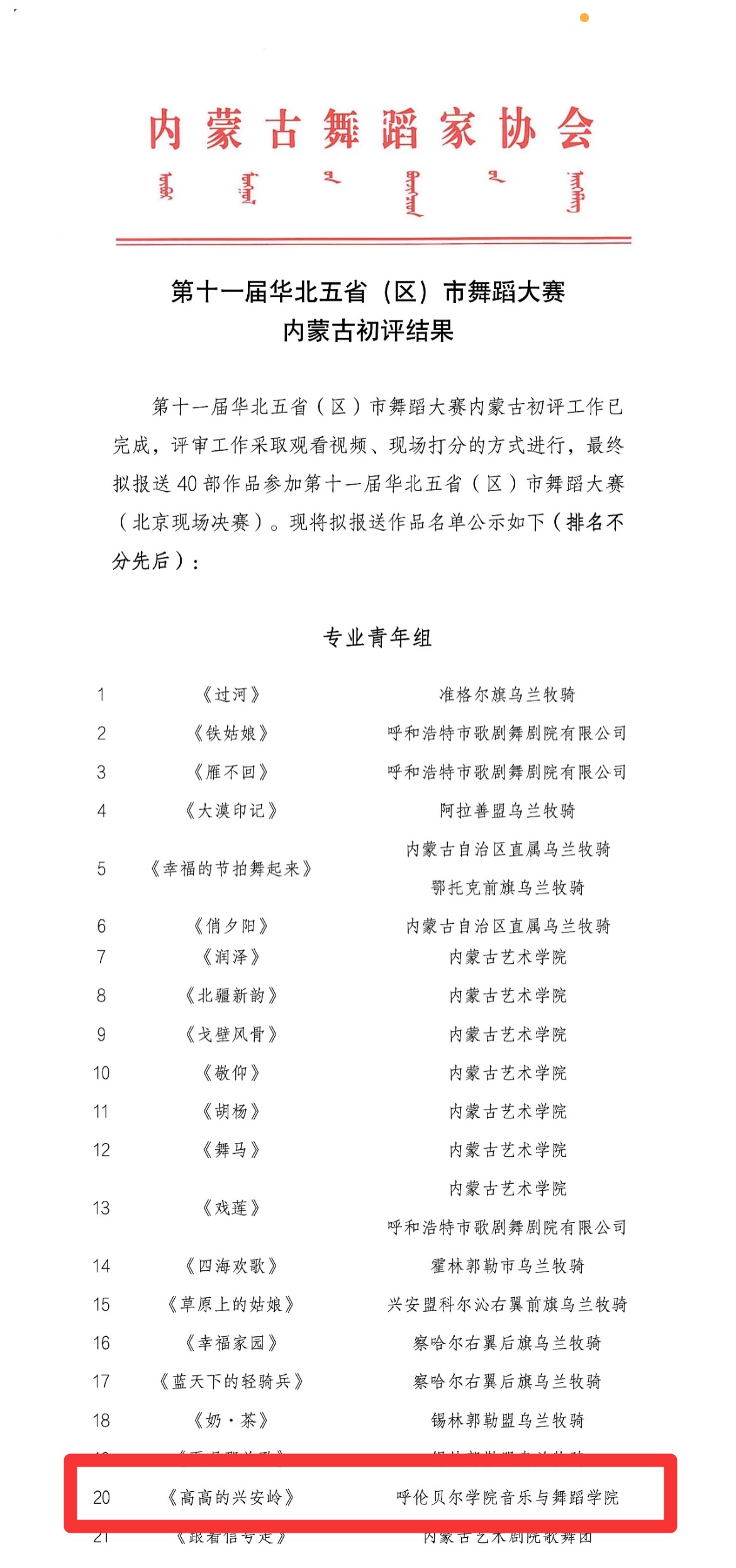 英国威廉希尔公司选送的舞蹈作品《高高的兴安岭》入围第十一届华北五省(区)市舞蹈大赛专业青年组参赛作品。也是呼伦贝尔唯一入围的参赛团队。决赛将于2024年7月14-20日在北京进行。