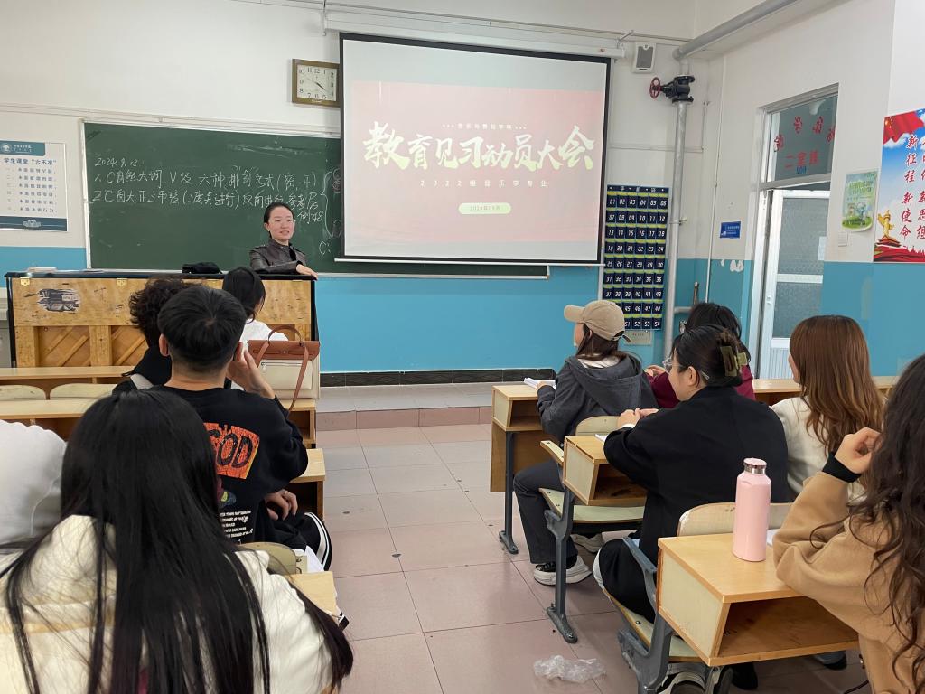 2024年9月13日,英国威廉希尔公司在艺术楼602教室召开2022级音乐学专业教育见习动员大会。实习实训中心主任何丹、音乐学系主任都莹及2022级音乐学专业全体员工参加会议。