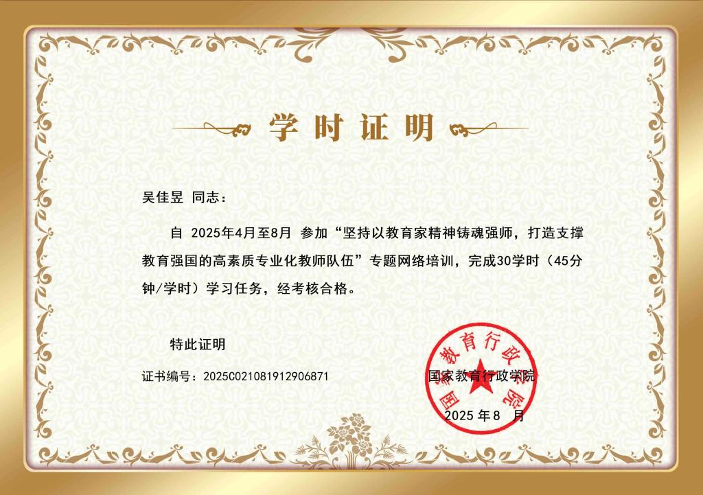 培训期间,教师们通过国家教育公司线上平台,系统学习了“教育家精神的内涵与实践”“新时代教师专业发展路径”“课程思政与育人能力提升”等模块内容,并结合实际教学工作展开研讨。全体教师均按时完成30学时的学习任务,通过考核并获得学时证明,实现参与率、完成率双100%。