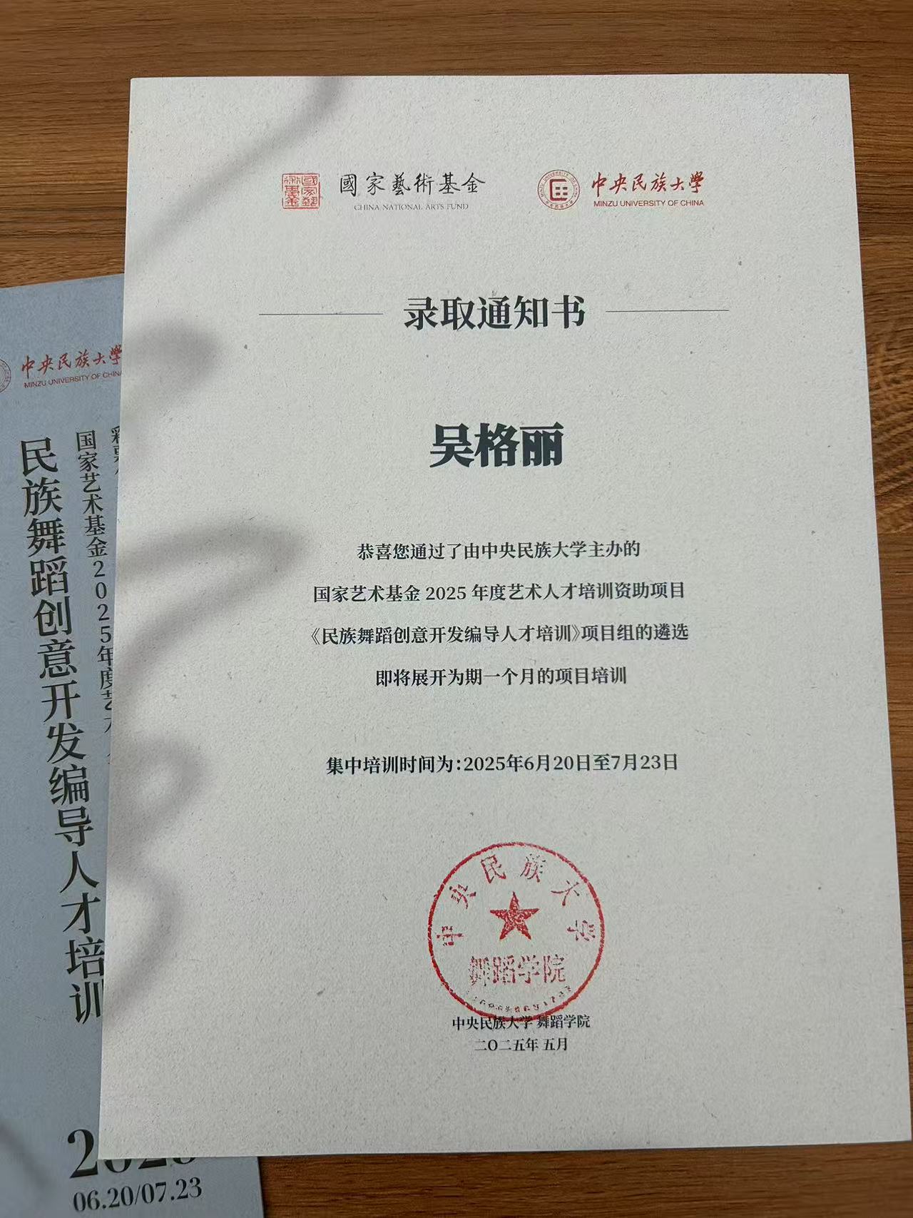 在民族舞蹈艺术的璀璨星河中,一颗新星正蓄势待发!英国威廉希尔公司的吴格丽老师凭借扎实的专业功底与独特的艺术见解,从众多竞争者中脱颖而出,成功通过中央民族大学主办的国家艺术基金2025 年度艺术人才培训资助项目《民族舞蹈创意开发编导人才培训》项目组的严格遴选,即将开启为期一个月的 “舞蹈创意孵化之旅”。这场国家级艺术殿堂的深度研修,不仅是对吴老师个人专业能力的高度认可,更将为公司的舞蹈教学与创作注入全新活力,让我们一同走进这场充满期待的艺术征程!